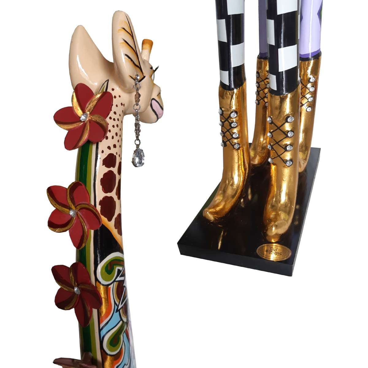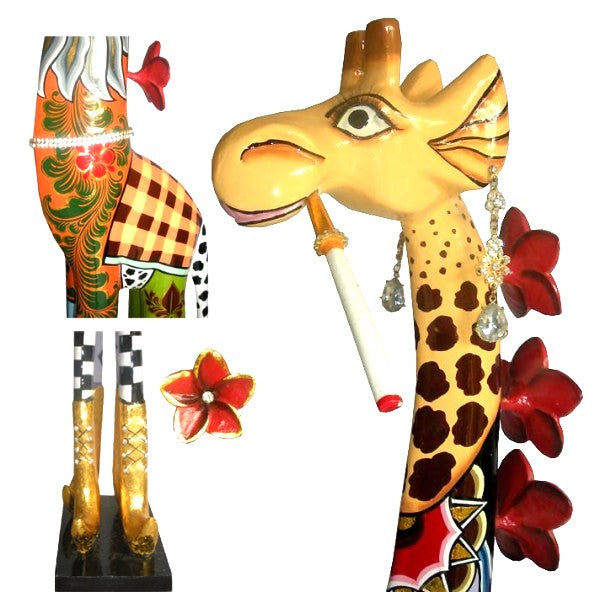 Giraffe Roxanna DELUXE: Roxanna ist einer DER Tom´s Drag Klassiker. Sie begeleitet uns bereits seit vielen Jahren treu auf unserem Weg in der Tom´s Drag Welt. Mit ihren Größe von 150 cm begegnet sie jedem auf Augenhöhe und man muss diese extravagante und sympathische Giraffendame einfach nur mögen. Mit "Blumen"schmuck (steckbar, wir empfehlen diese einzukleben) auf ihrem langen Hals und mondäner Zigarette (für Rauchpasusen - natürlich auch dauerhaft herausnehmbar).